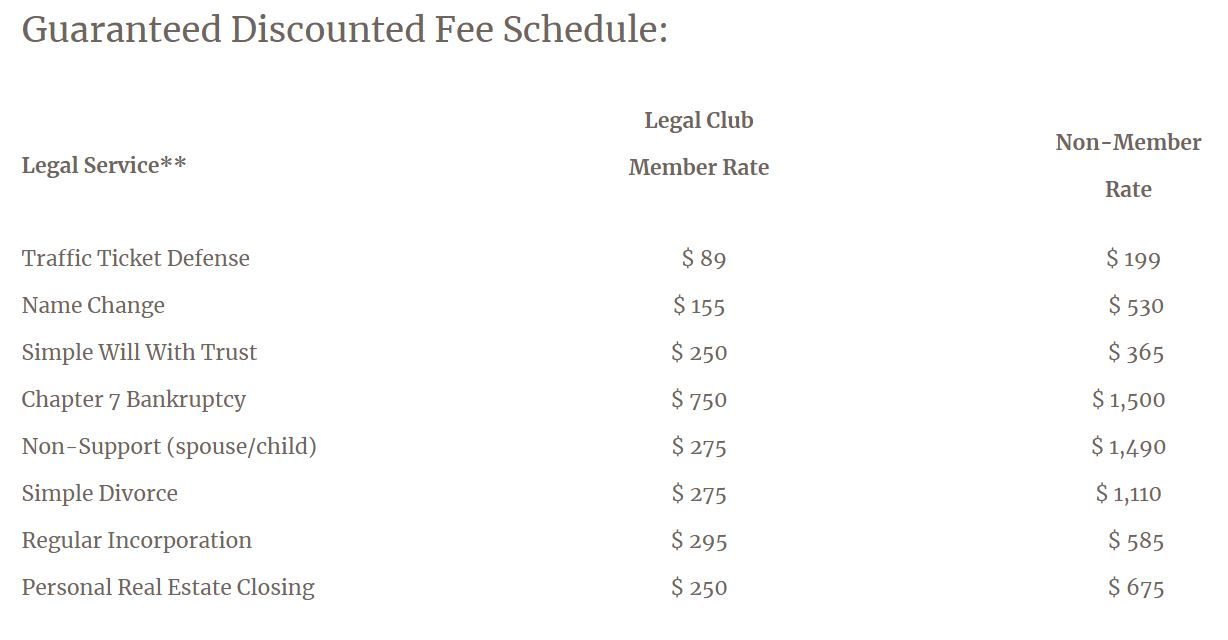 ** Fees are for legal services rendered. They do not include filing fees, costs, or administrative expenses. Please review the definitions section of your plan member guidebook. Legal care provided to members that goes beyond the free and discounted services will be charged at the low hourly rate of $125.00, or 40% off the plan attorney’s usual and customary hourly rate, whichever is greater.